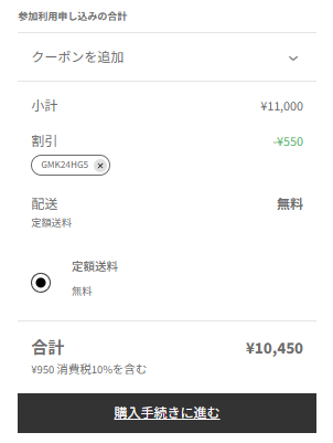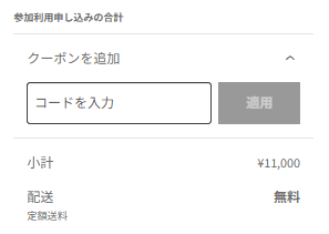 「クーポンコード」入力枠が表示されますので、使用できるクーポンを入力して、「適用」ボタンを押してください。画面が表示されます。